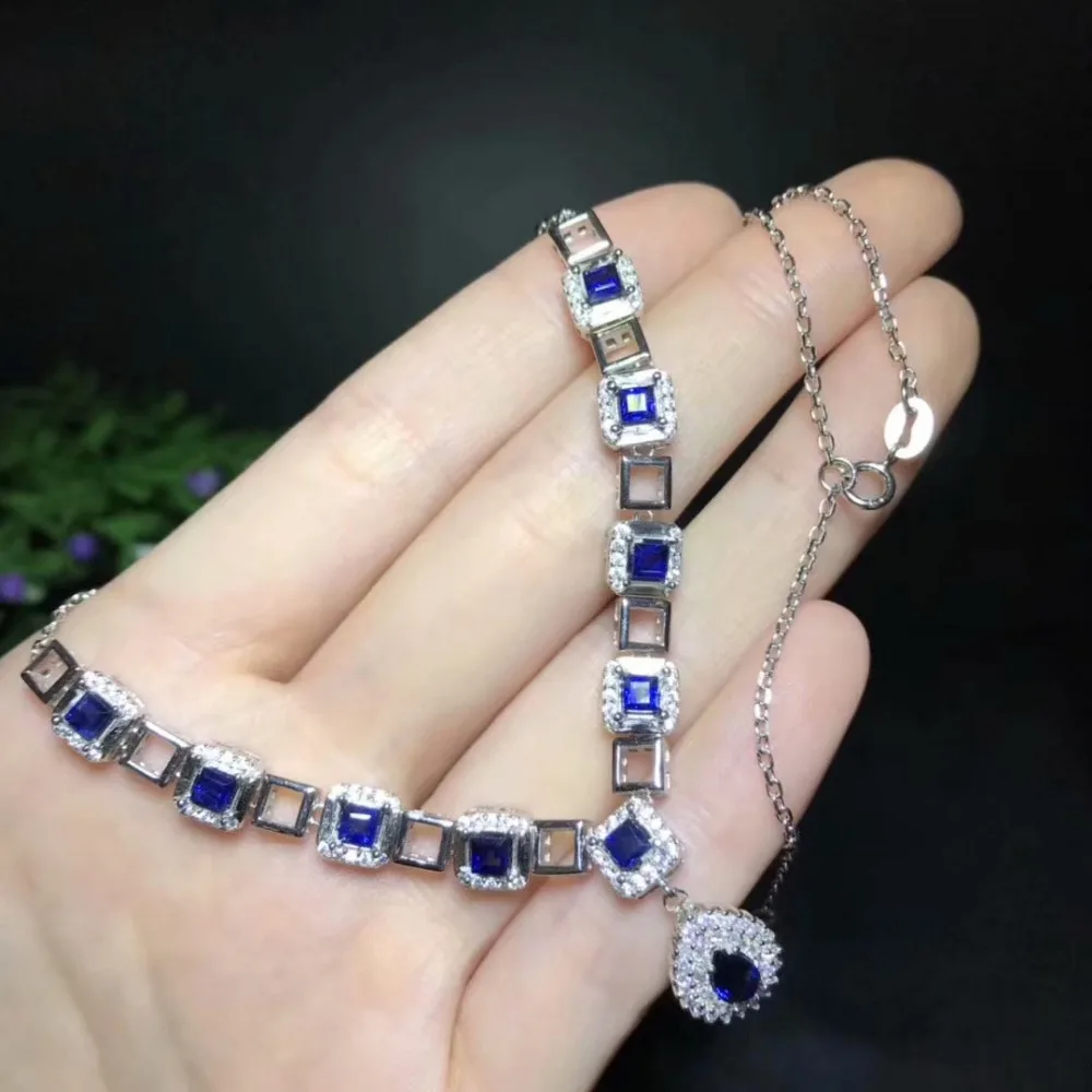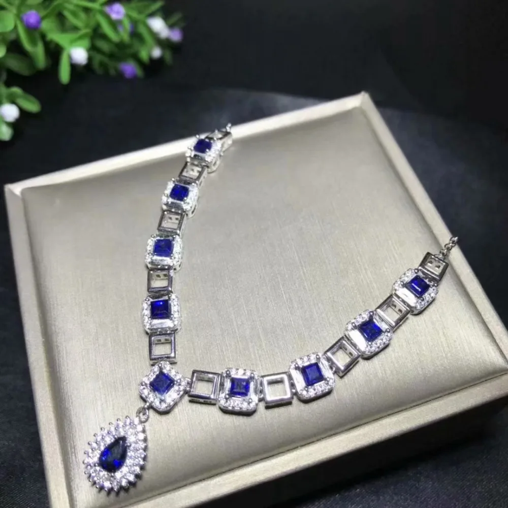 Product Name: قلادة من الياقوت الأزرق الطبيعي عقد من الأحجار الكريمة الطبيعية 925 فضية اللون للنساء فاخر عصري مربع مجوهرات الخطوبة للنساء