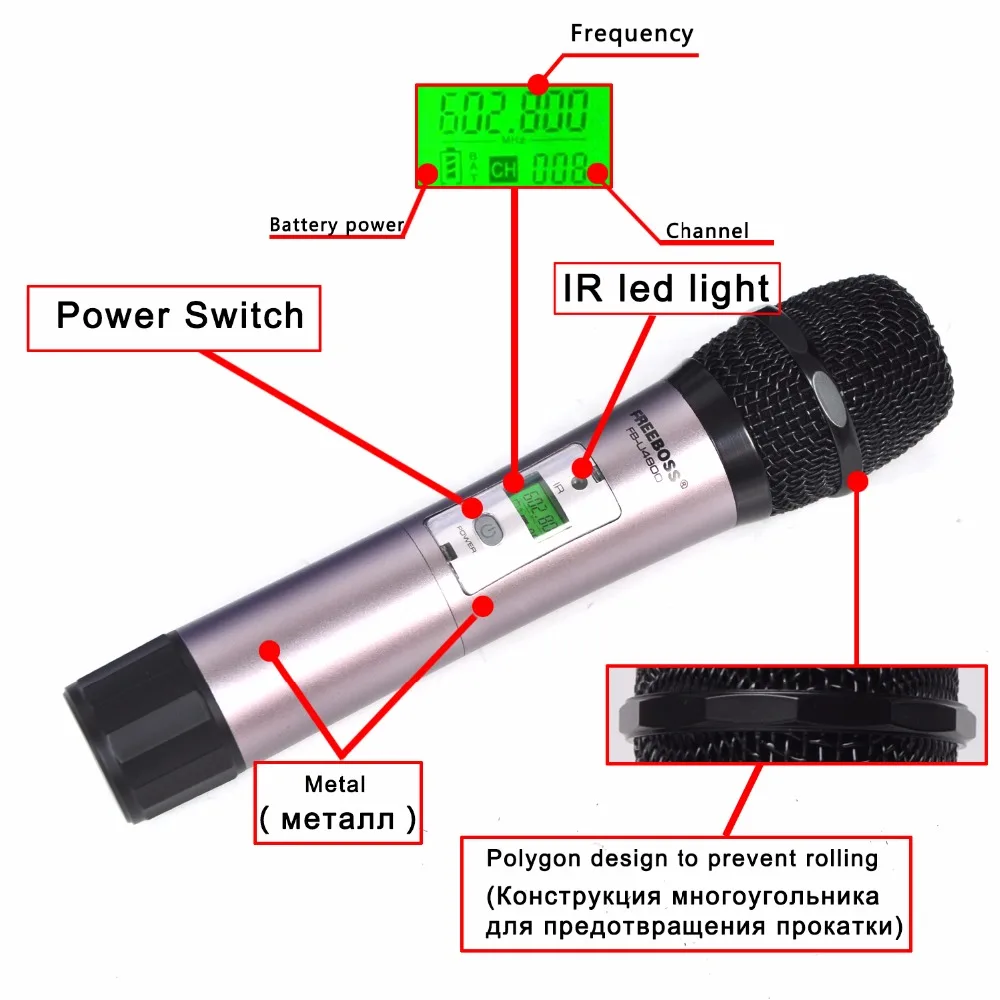 Product Name: Freeboss 4 Way 4*100 قنوات PLL IR تردد مكبر صوت لا سلكي ذو تردد فوق العالي مع 2 Handhelds المعدنية 2 هيئة حزمة الارسال KTV هيئة التصنيع العسكري