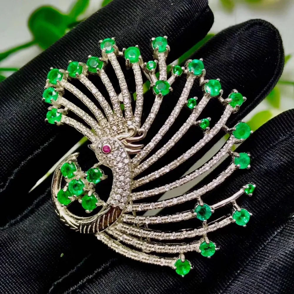 Product Name: الطبيعية الخضراء الزمرد أنيقة فخمة أجنحة الطاووس بروش قلادة الاحجار الطبيعية بروش S925 فضة النساء هدية مجوهرات