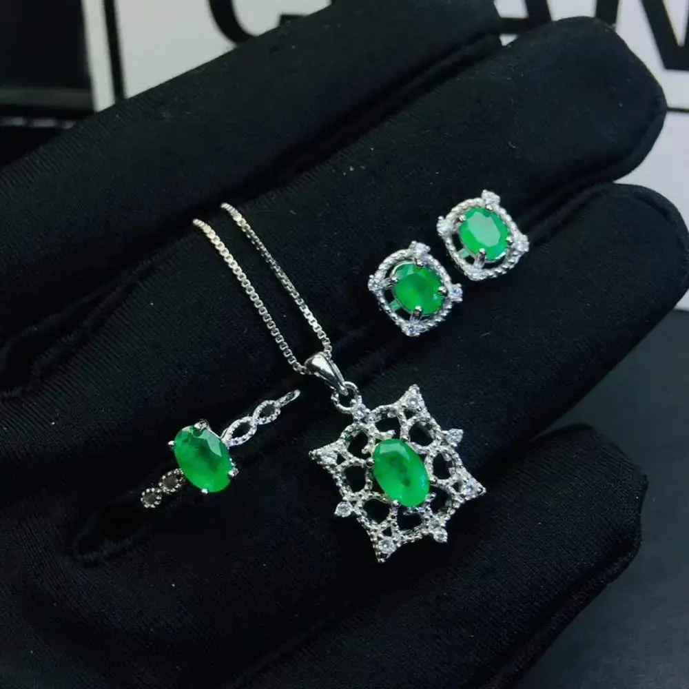 Product Name: ريال الطبيعية الزمرد طقم مجوهرات الطبيعية ريال الزمرد 925 فضة 1 قطعة قلادة ، 1 قطعة حلقة ، 2 قطعة القرط