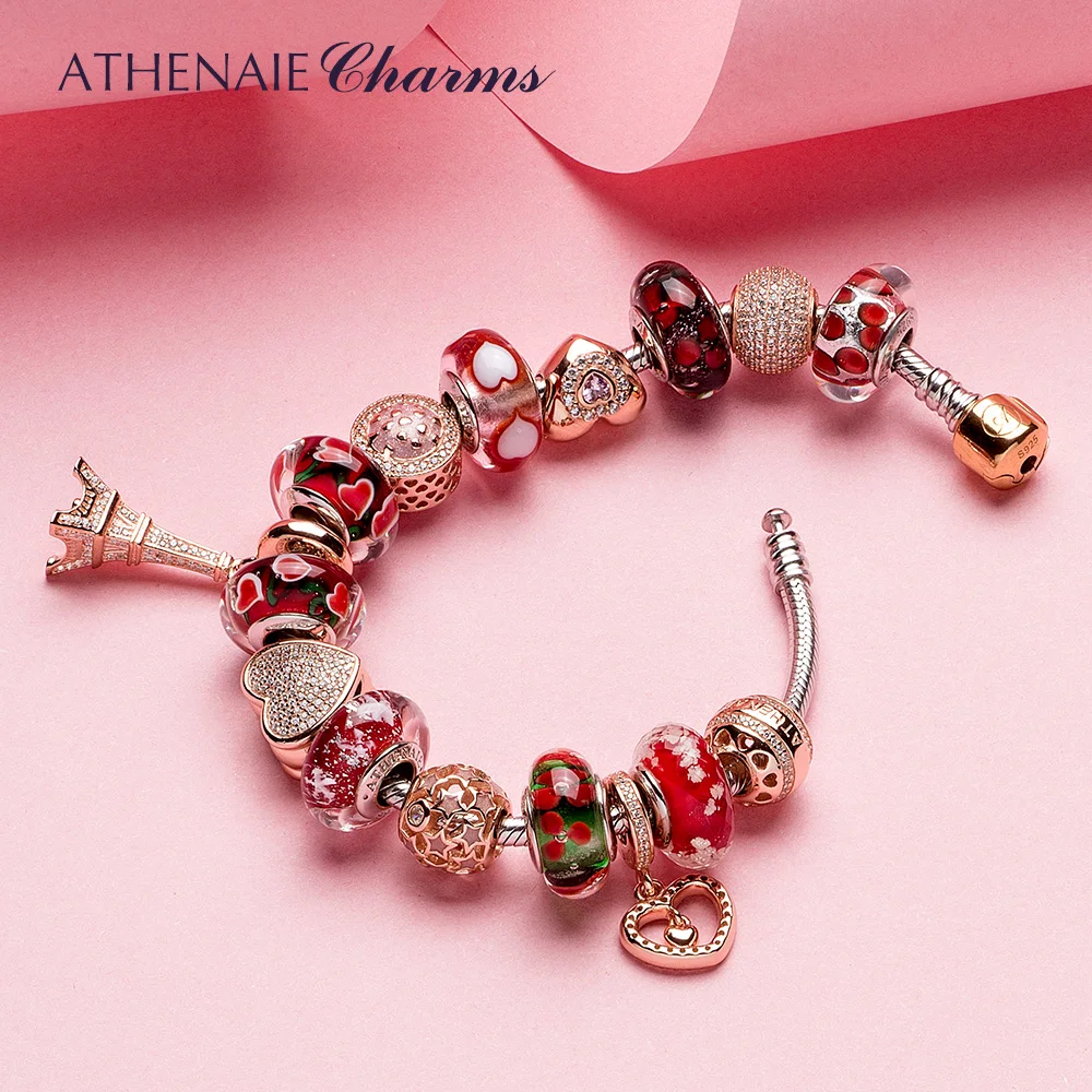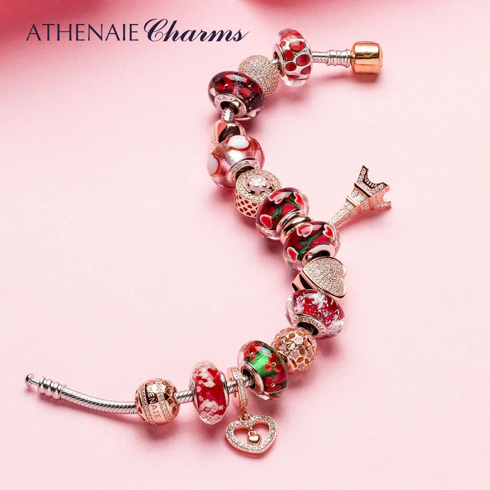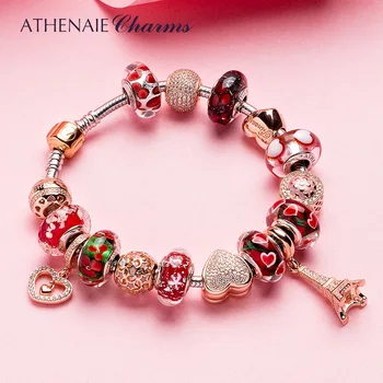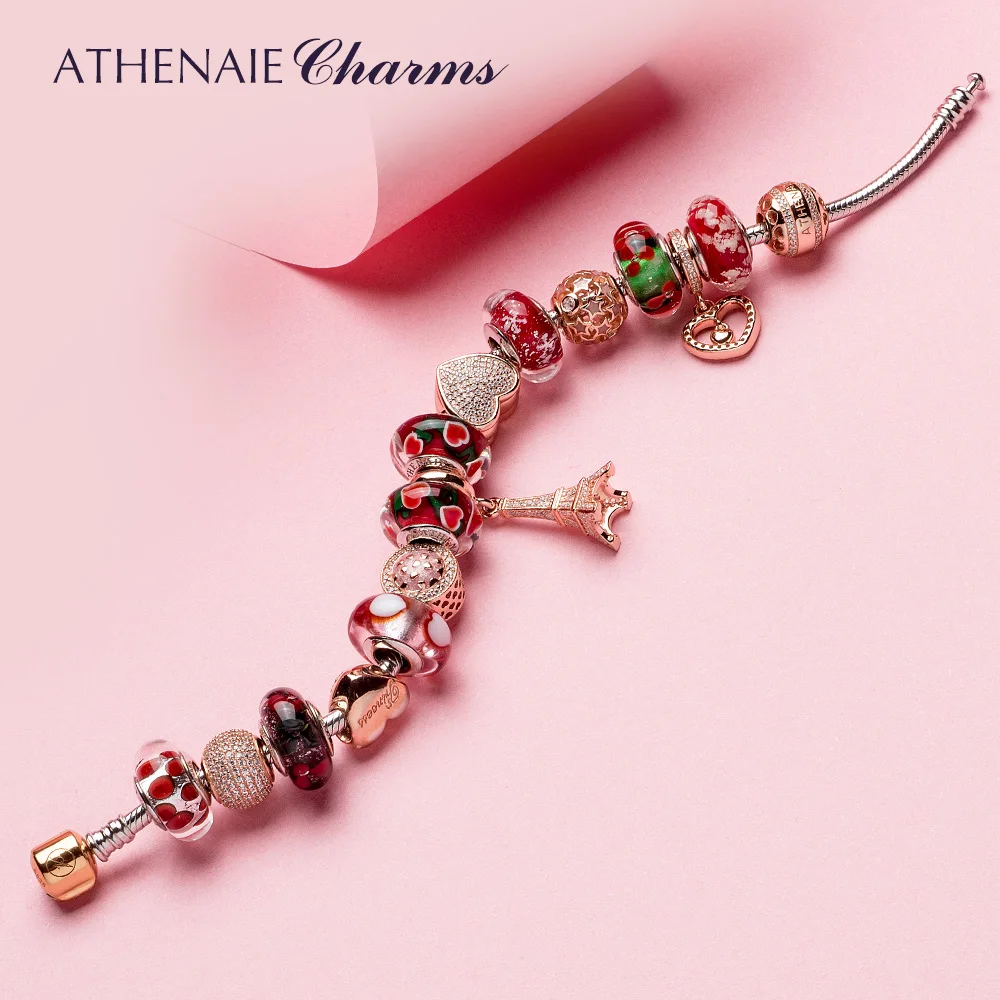 Product Name: ATHENAIE 925 سوار الفضة ارتفع الذهب برج ايفل قلادة والقلب خرز تميمة أساور للنساء لتقوم بها بنفسك مجوهرات هدية