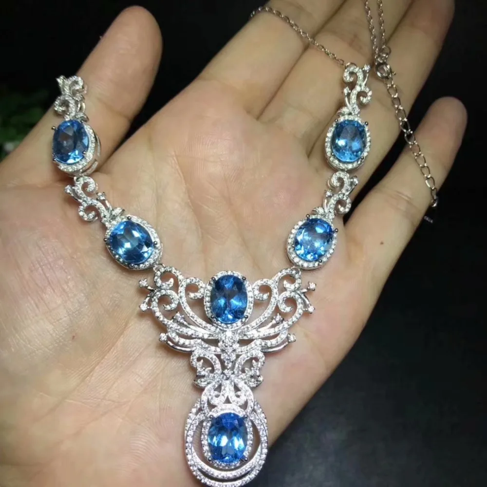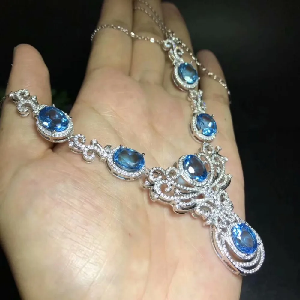 Product Name: الطبيعية الأزرق توباز جوهرة قلادة الأحجار الكريمة الطبيعية قلادة قلادة S925 الفضة الفاخرة الرجعية جوفاء النساء هدية مجوهرات الحفلات