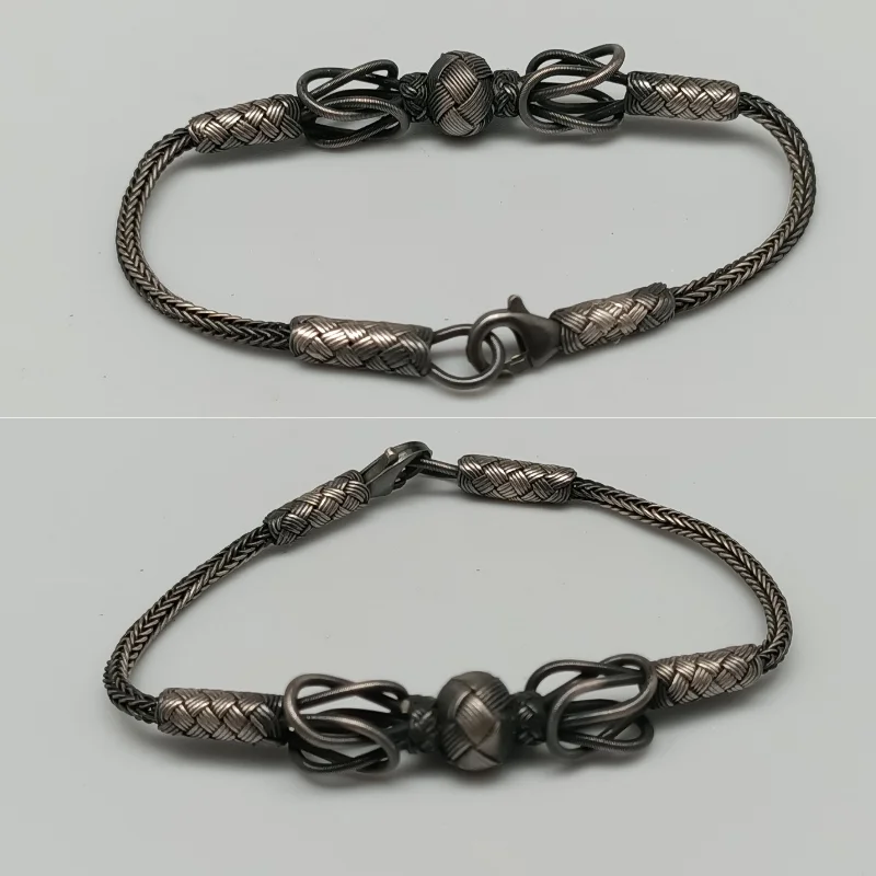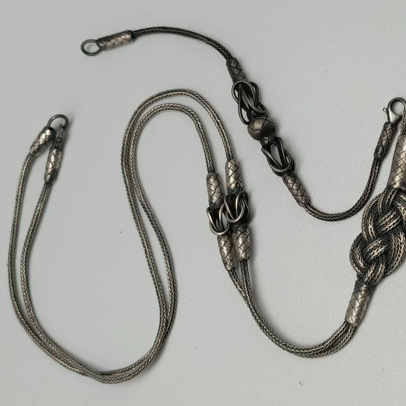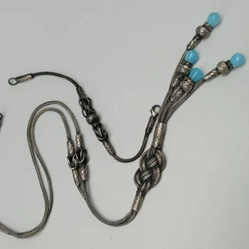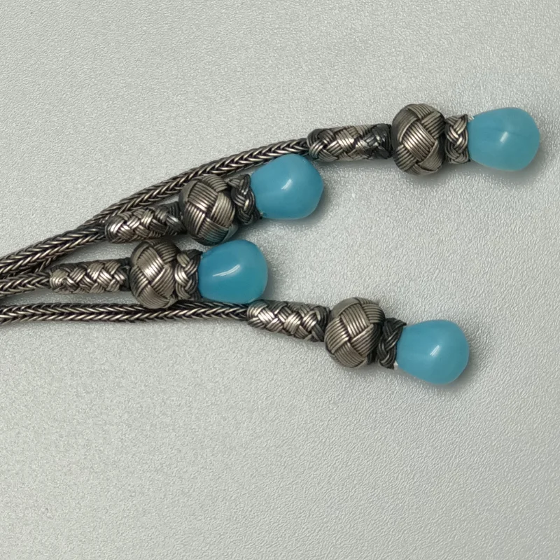 Product Name: سوار وقلادة كازاز من طرابزون مصنوع يدويًا من الفضة الاسترليني المؤكسدة عيار 1000 مع قلادة بشراشيب مطرزة باللون الأزرق