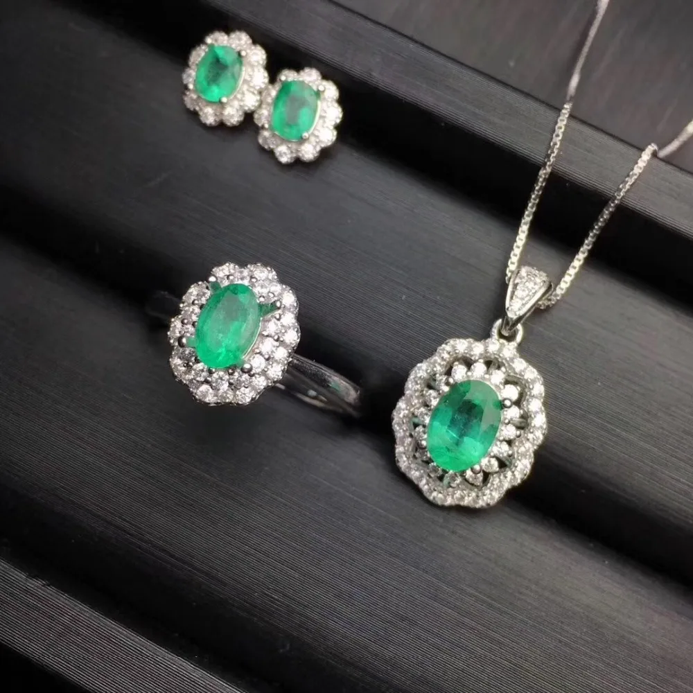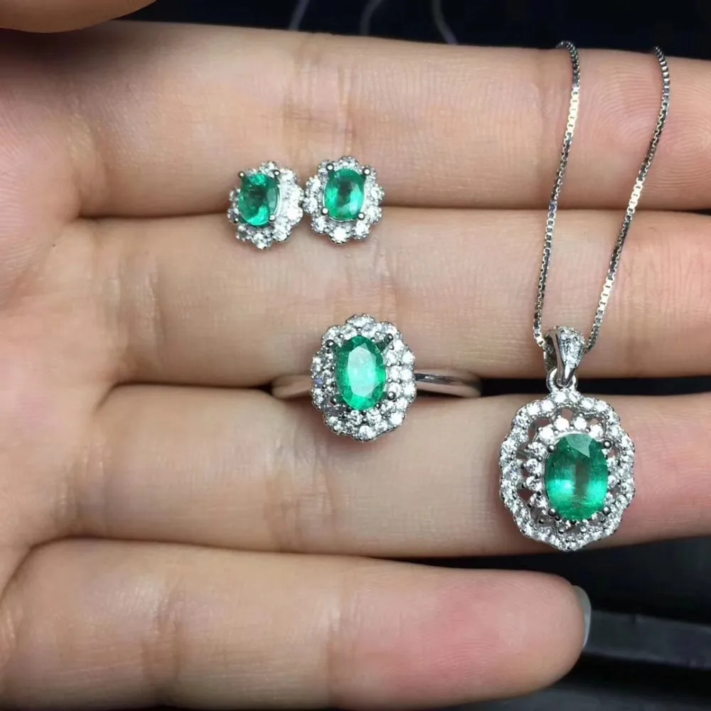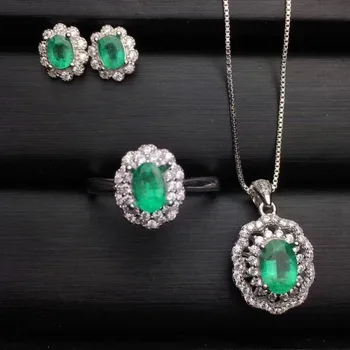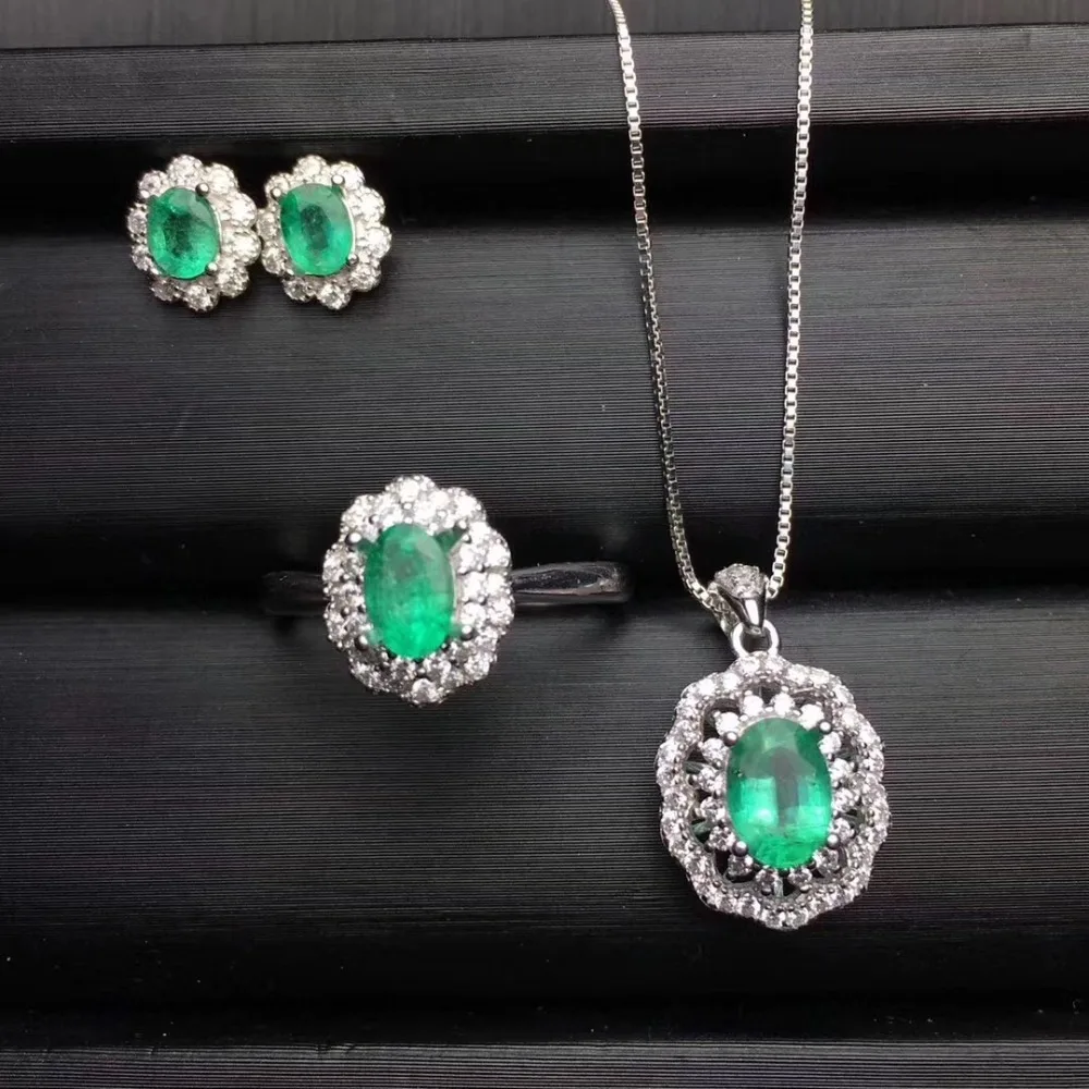 Product Name: طقم مجوهرات الزمرد الطبيعية والحقيقية الطبيعية ريال الزمرد 925 فضة 1 قطعة قلادة ، 1 قطعة خاتم ، 2 قطعة القرط