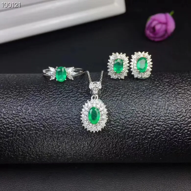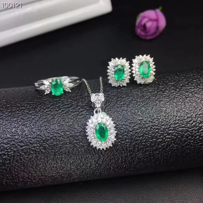 Product Name: طقم مجوهرات الزمرد الطبيعية والحقيقية الطبيعية ريال الزمرد 925 فضة 1 قطعة قلادة ، 1 قطعة خاتم ، 2 قطعة القرط