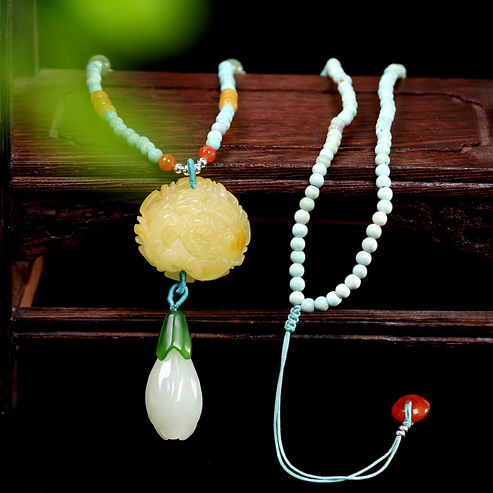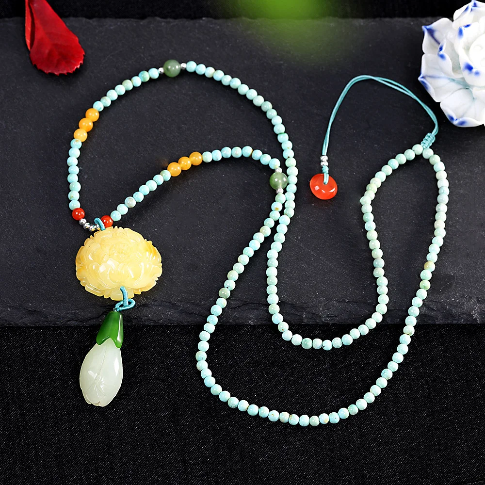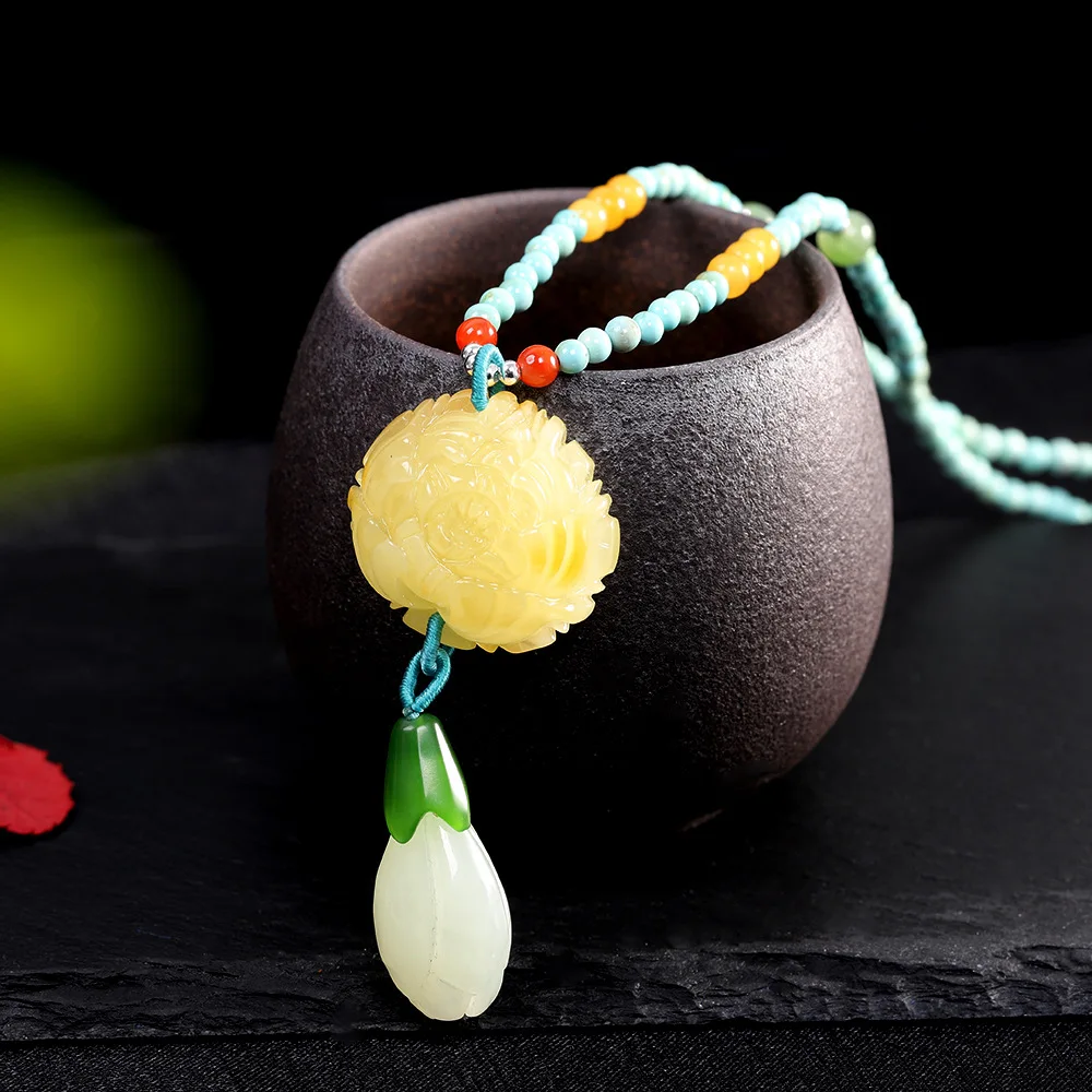 Product Name: قلادة فاخرة من Uglyless سلاسل صغيرة من الفيروز الطبيعي مطرز بالخرز للسيدات قلادات من شمع العسل بالزهور والعنبر مجوهرات من حجر اليشم ماغنوليا