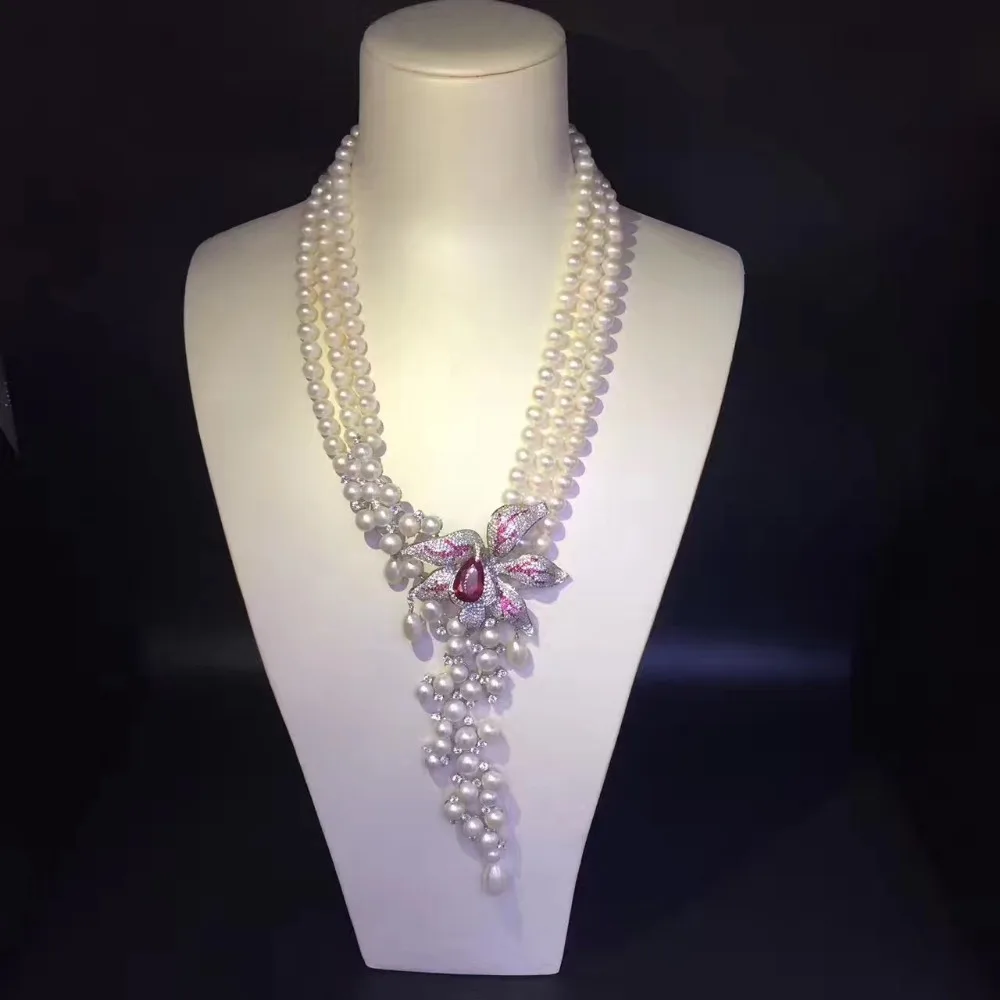 Special Offer 100% قلادة لؤلؤ المياه العذبة حقيقية مثقف 925 زهرة فضة متعددة الطبقات موضة النساء قلادة الزفاف Discount 0% Today!