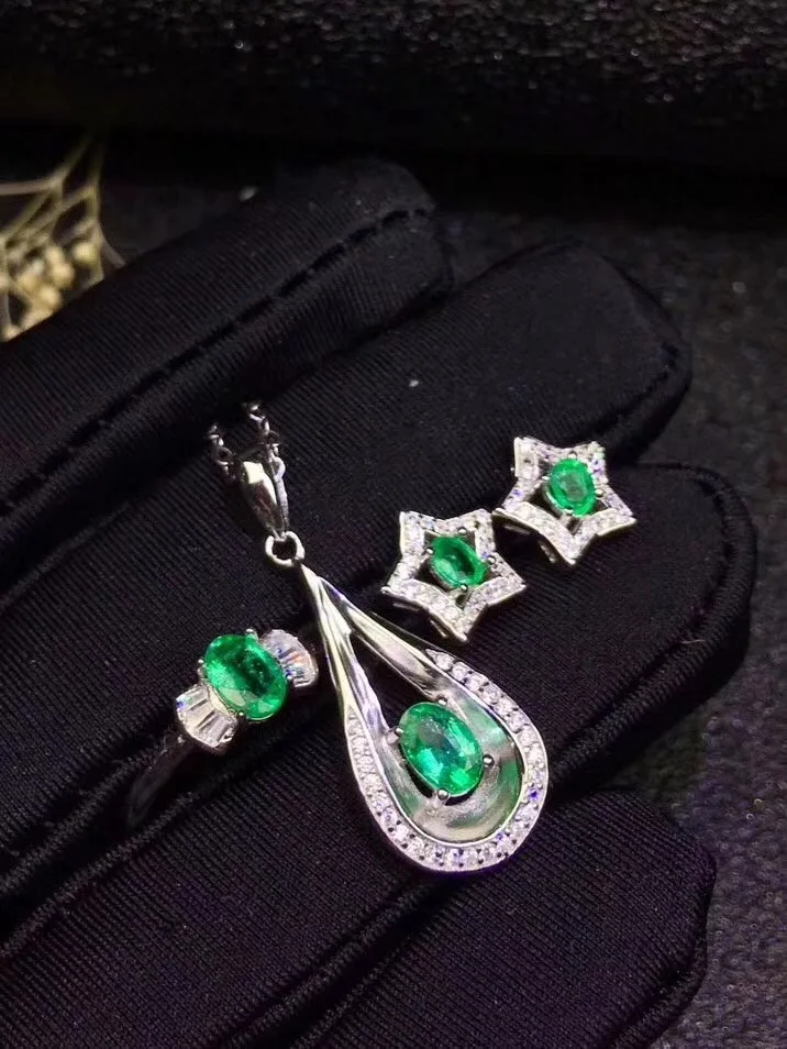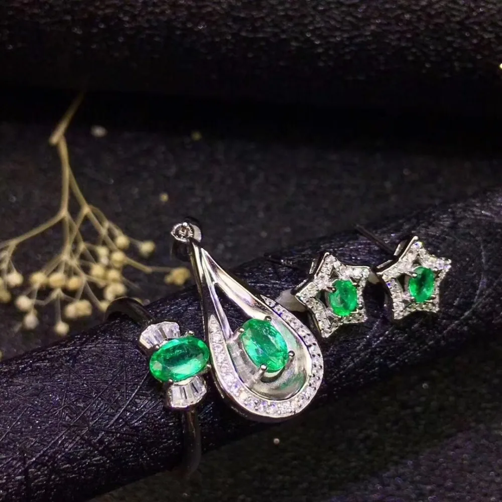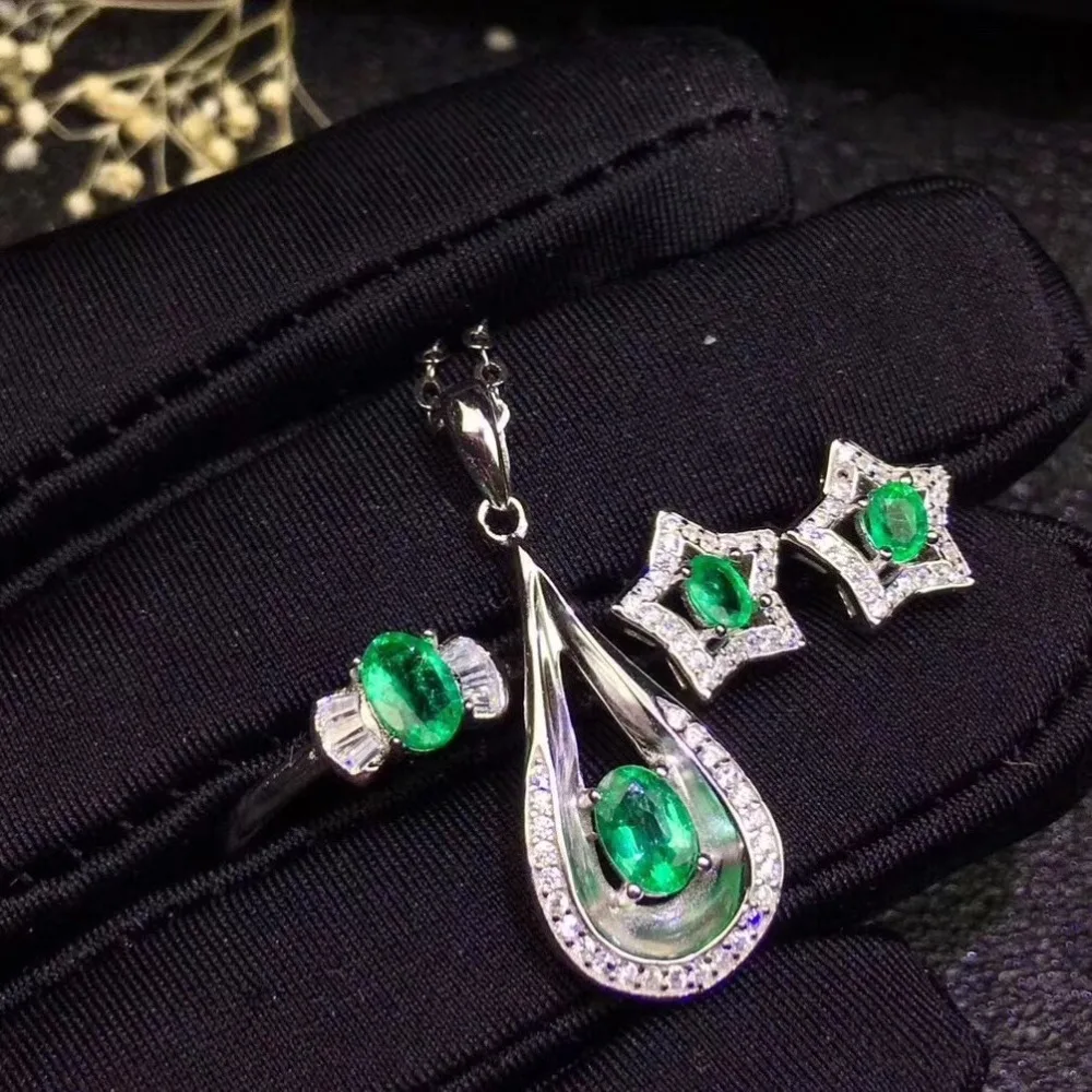 Product Name: طقم مجوهرات الزمرد الطبيعية والحقيقية الطبيعية ريال الزمرد 925 فضة 1 قطعة قلادة ، 1 قطعة خاتم ، 2 قطعة القرط