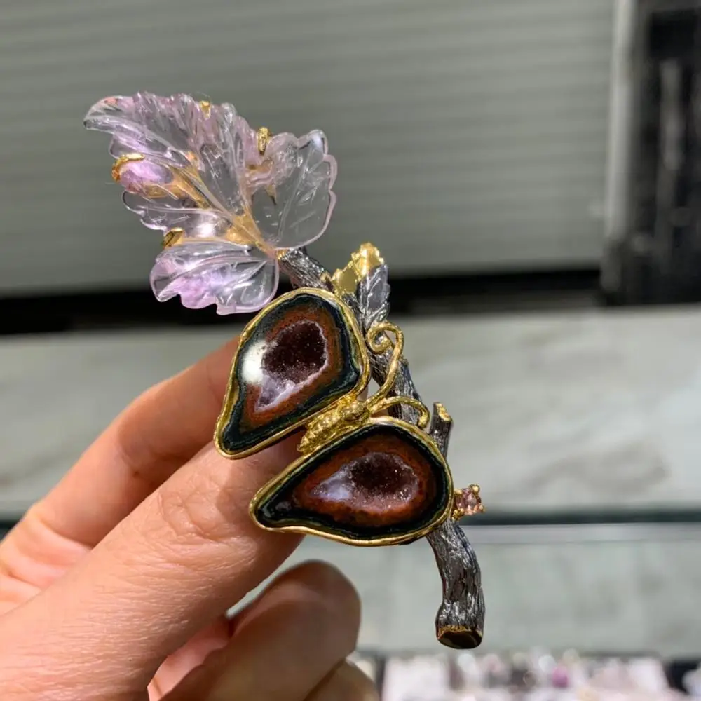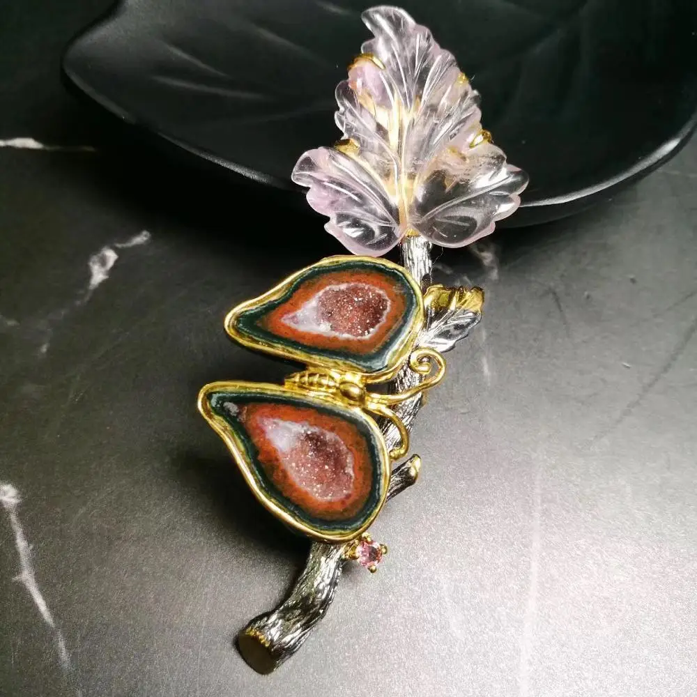 Product Name: العقيق الطبيعي و الكريستال فراشة بروش Amethy ليف بروش و قلادة مزدوجة استخدام غرامة مجوهرات فاخرة 925 فضة