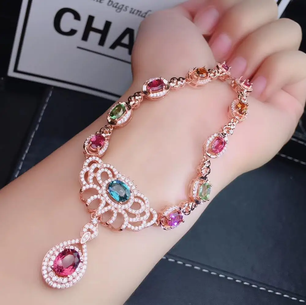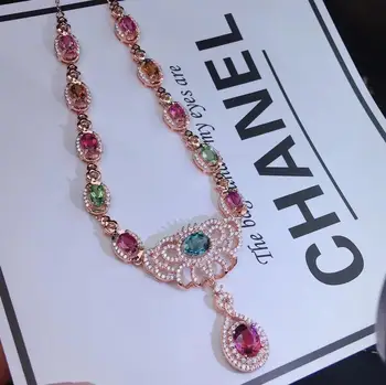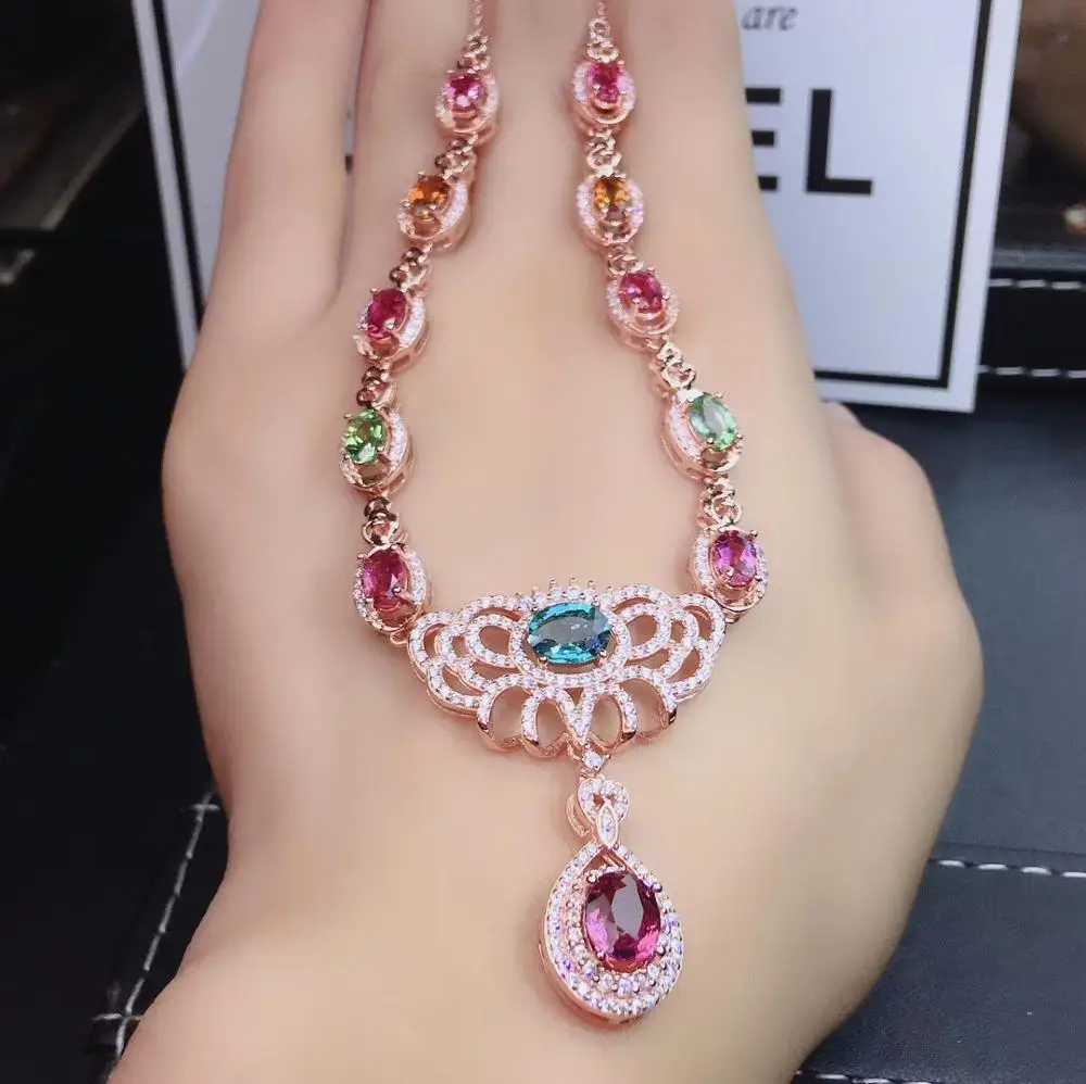 Product Name: الفاخرة الرجعية تاج الطبيعي متعدد الألوان التورمالين قلادة قلادة S925 الفضة الطبيعية الأحجار الكريمة قلادة فتاة هدية غرامة المجوهرات