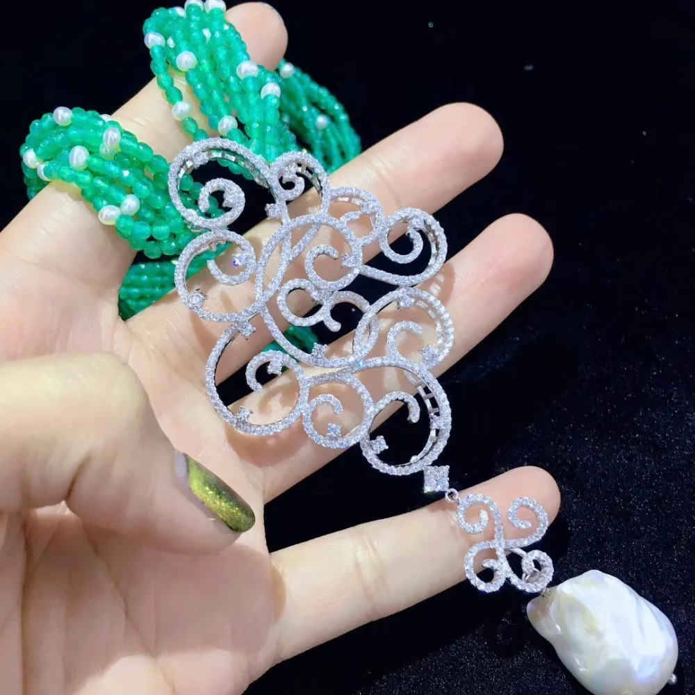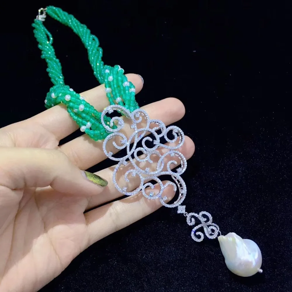 Special Offer الباروك لؤلؤ طبيعي من المياه النقية قلادة قلادة الحجر الأخضر متعدد الطبقات تويست 925 فضة مكعب الزركون 19 بوصة Discount 0% Today!
