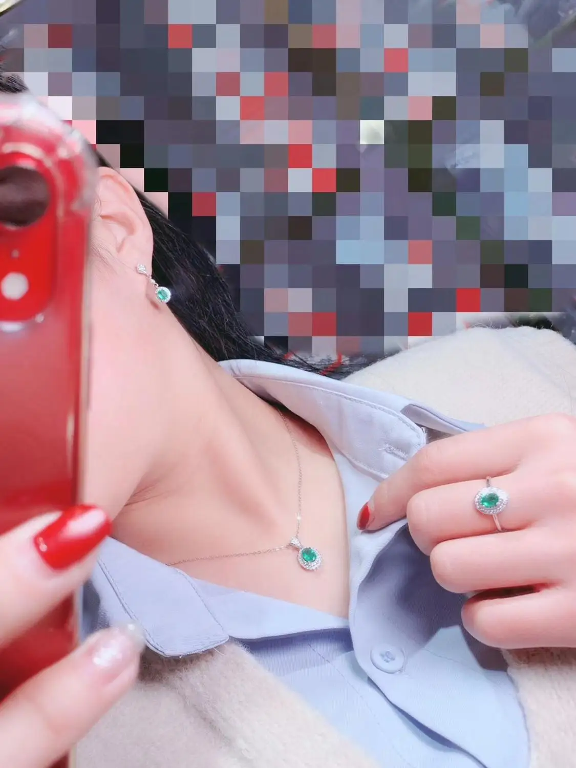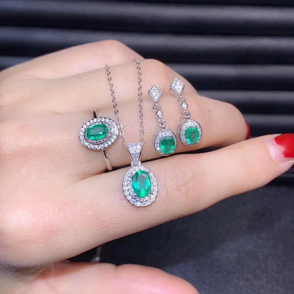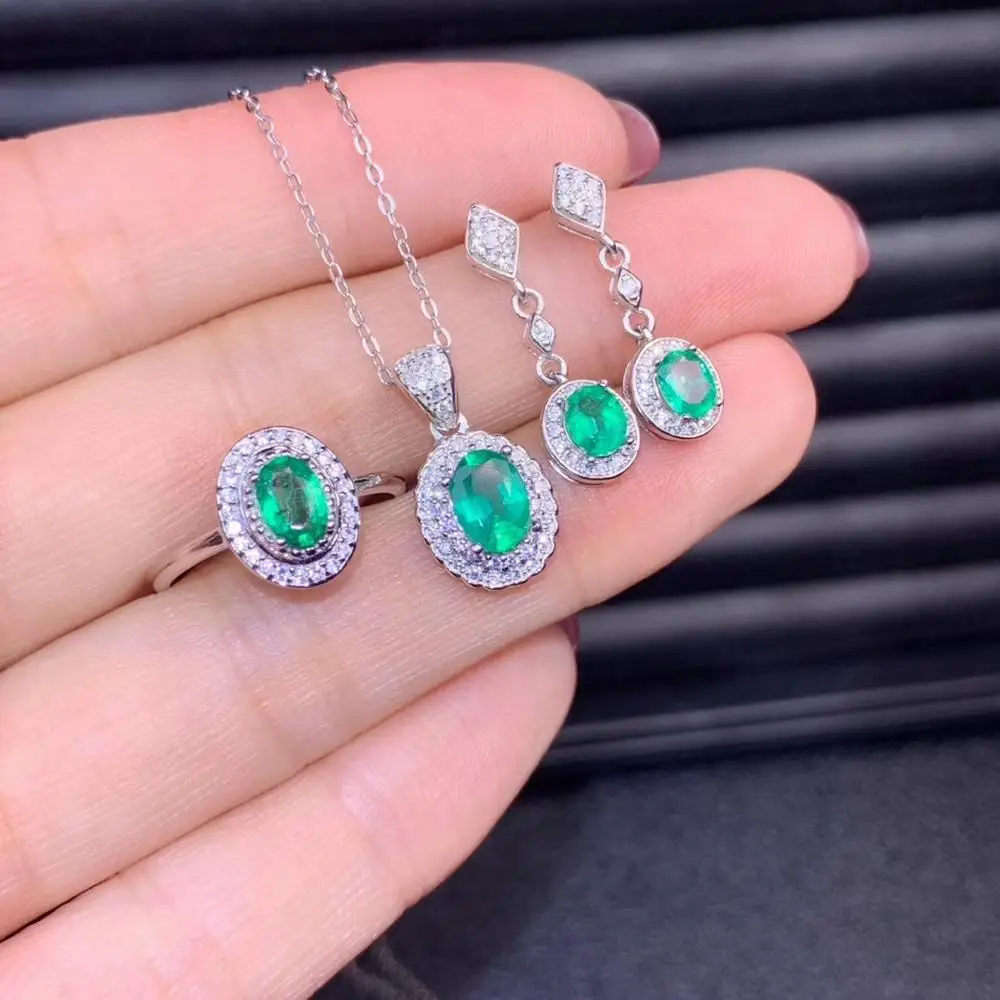 Product Name: أزياء بسيطة جولة الطبيعي الأخضر الزمرد جوهرة S925 الفضة قلادة عصابة الأقراط الأحجار الكريمة الطبيعية طقم مجوهرات فتاة حزب مجوهرات